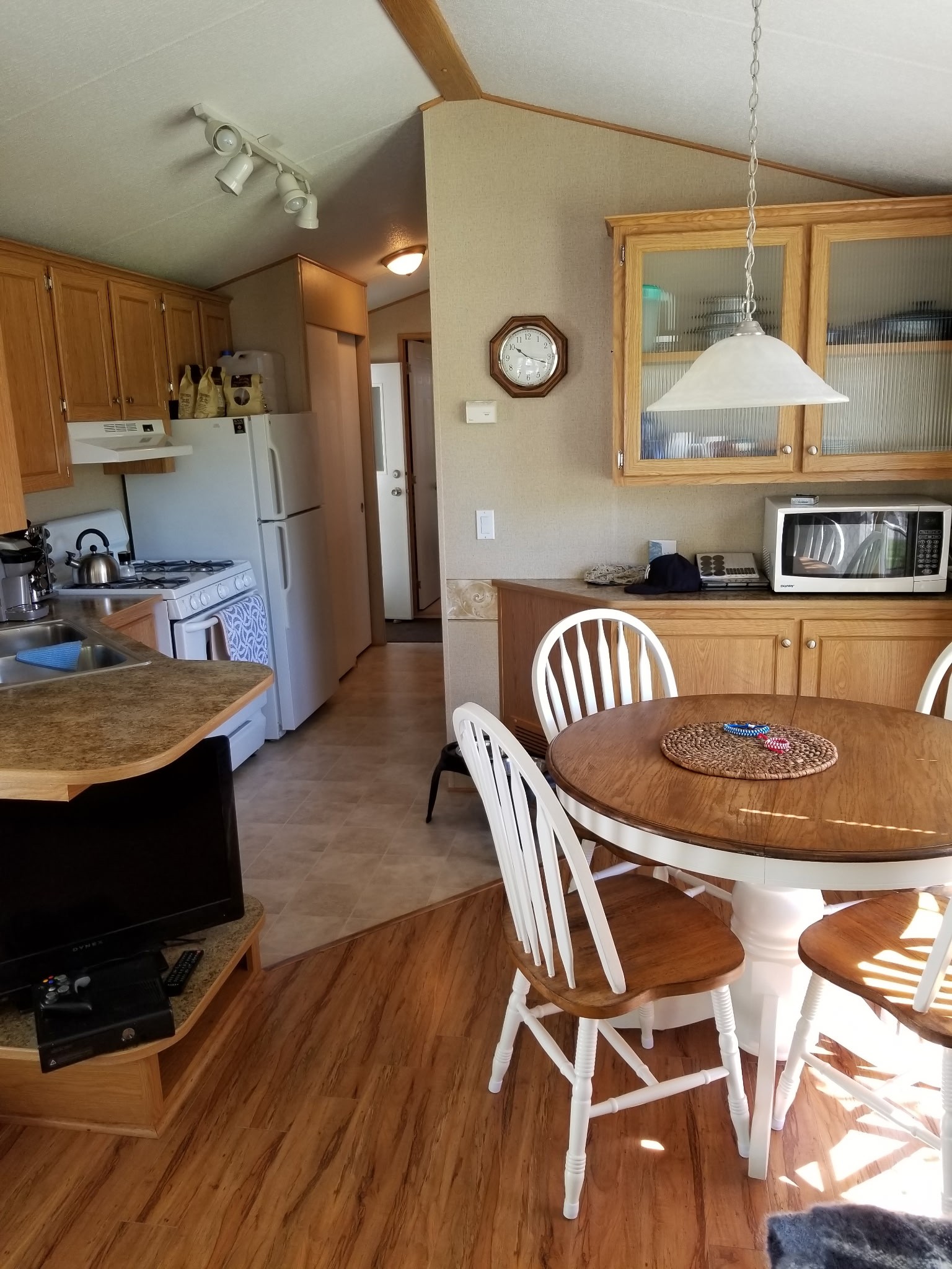 Includes: Fridge, microwave, dinette, pull out couch, 2 recliners, TV, A/C, propane heat, BBQ, lawnmower, patio set, outdoor dining set, 2 ladders, propane fire table.